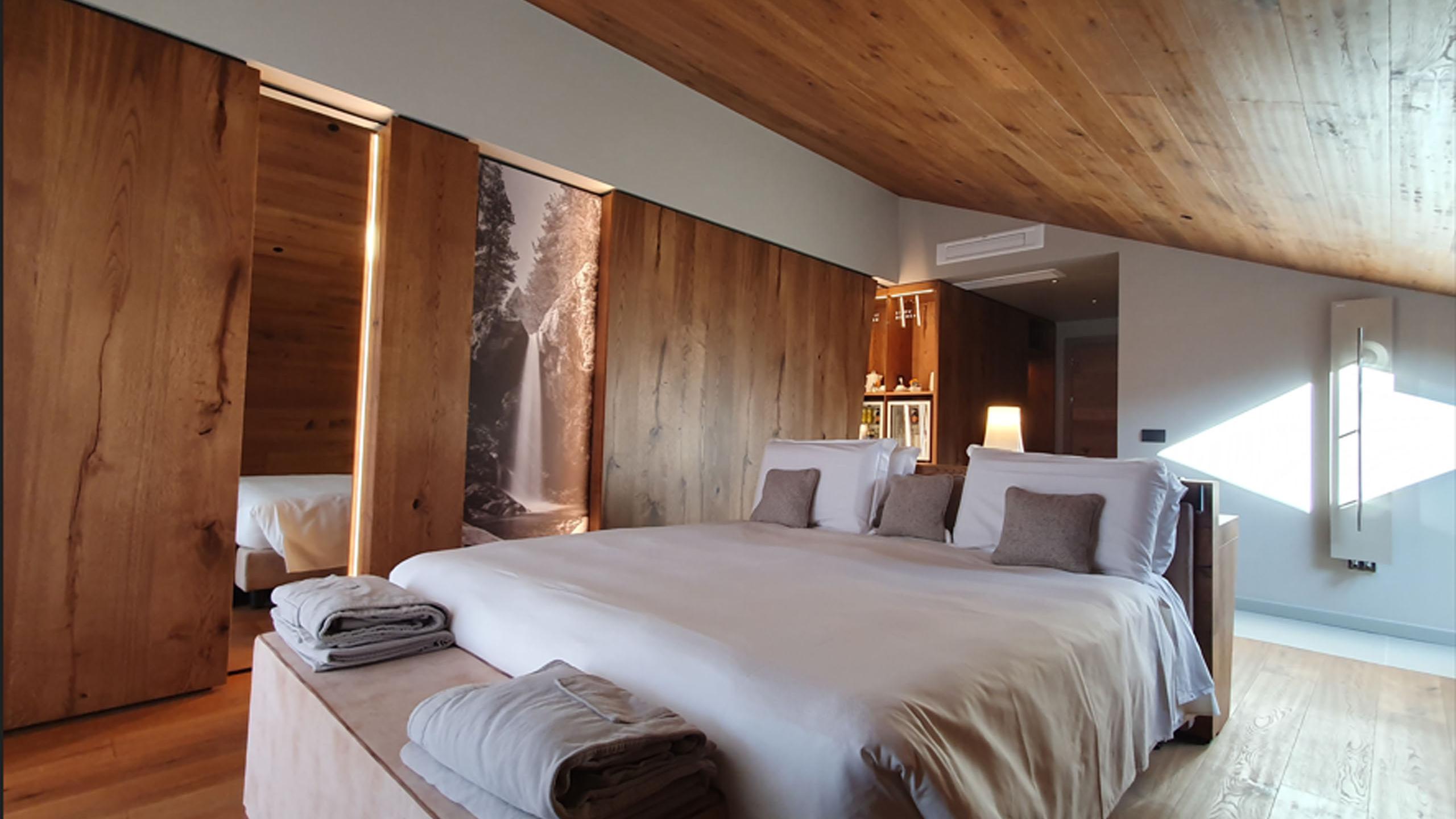 The private balcony offers wonderful views of Mont Avic Natural Park, allowing yourself to immerse yourself in the beauty of nature 24/7. The interiors are thoughtfully designed with natural materials and warm tones, creating a serene and inviting atmosphere. A sleek, clean-lined ceiling adds a touch of elegance and harmony to complete the space.